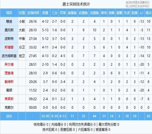 勇士:波斯特13分5板、波杰姆斯基12分7板4助、桑托斯11分10板2助、斯潘塞10分5板6助、穆迪10分4板1助、戴维斯8分4板1助2断、莱昂斯6分4板1助