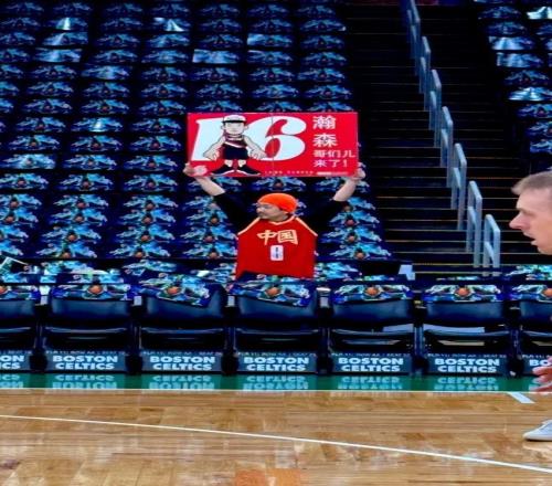 一球迷身穿中国男篮球衣并举牌支持小杨:瀚森哥们来了