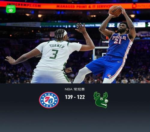第四节76人麦凯恩拿下12分,雄鹿库兹马拿下5分,最终76人139-122战胜雄鹿