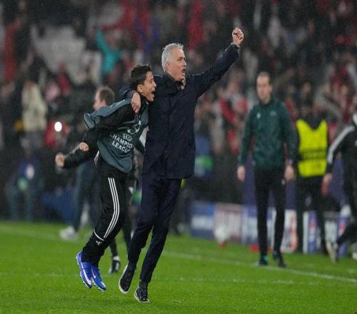 赛后,场边的穆里尼奥飞奔庆祝!一如22年前的欧冠边线的狂奔,而如今穆帅早已白了头。他还冲着看台拍胸振臂狂欢,在附加赛对阵中,本菲卡将面对皇马或者国际米兰,值得一提的是,这两支球队都是穆里尼奥的前东家,穆帅也必定将回到伯纳乌或梅阿查这两座让自己无比熟悉的球场中的一座。