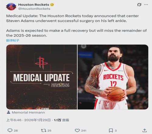 北京时间1月29日上午6点46分,休斯顿火箭官方宣布:球队中锋史蒂文-亚当斯今天成功接受左脚踝手术,将缺席本赛季剩余的所有比赛,2025-26赛季正式报销。亚当斯在10天之前打鹈鹕时脚踝三级扭伤,当时并没有说需要手术治疗。