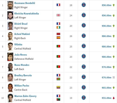 赢麻了巴黎包揽法甲身价前十,无亿元先生&三叉戟9000万领跑